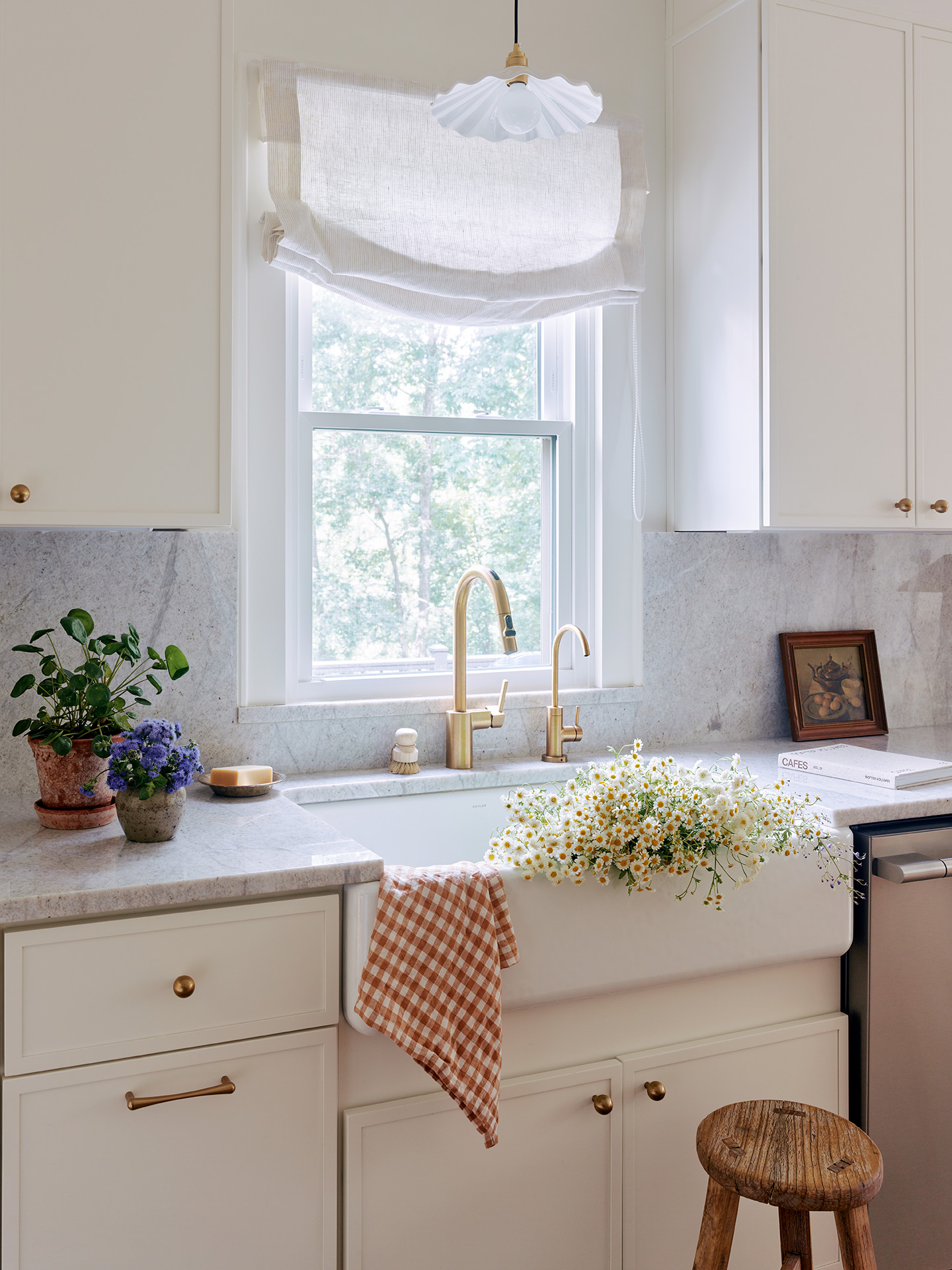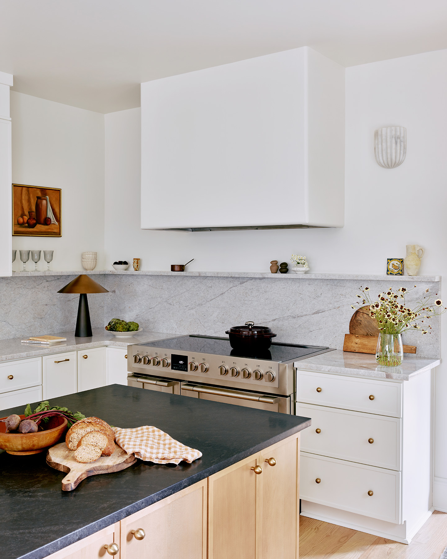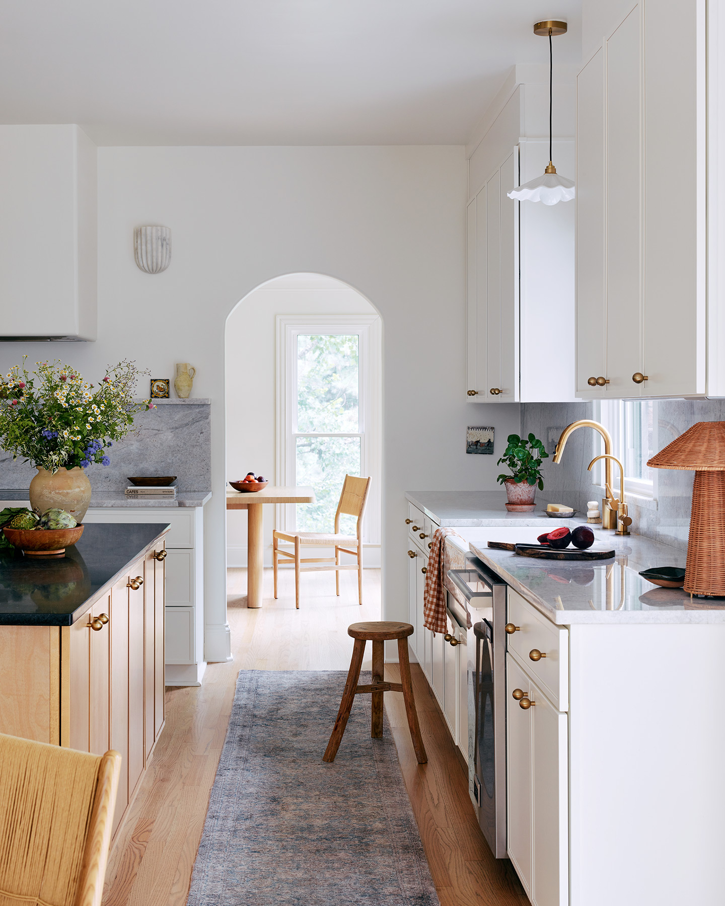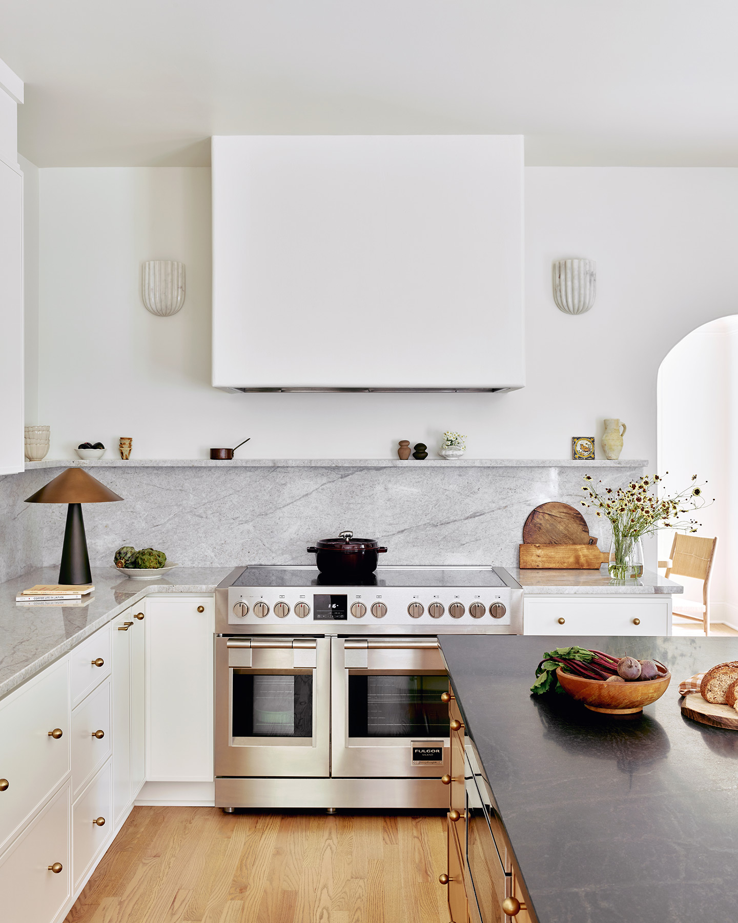 Lighting played a key role in redefining the atmosphere. Layered fixtures now bring warmth and a sense of architecture to every corner from the statement pendant in the breakfast nook to the soft glow from the marble sconces around the kitchen hood.